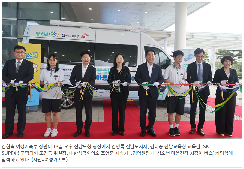 여성가족부는 13일 전라남도청 광장에서 김영록 전남도지사, 김대중 전남교육감, 에스케이(SK)·대한상공회의소 관계자 등 70여 명이 참석한 가운데 ‘청소년 마음건강 지킴이 버스’ 첫 시승식을 진행했다고 밝혔다.