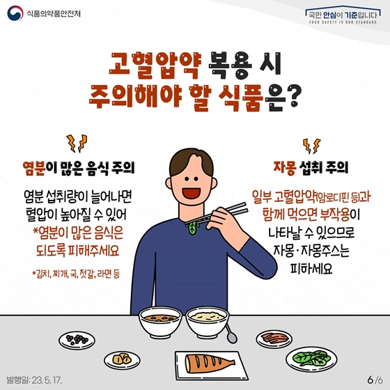 염분 섭취량이 늘어나면 혈압이 높아질 수 있어 염분*이 많은 음식은 되도록 피해주세요.