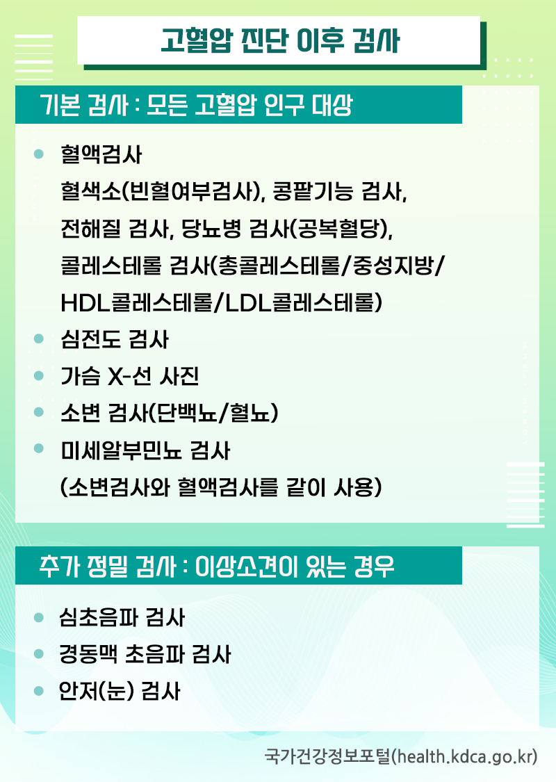 일반적으로 모든 고혈압 인구에서 하는 기본검사는 일반 건강검진에서 할 수 있는 검사들입니다. 기본검사에서 이상이 발견되면 추가로 정밀 검사를 진행할 수 있습니다.