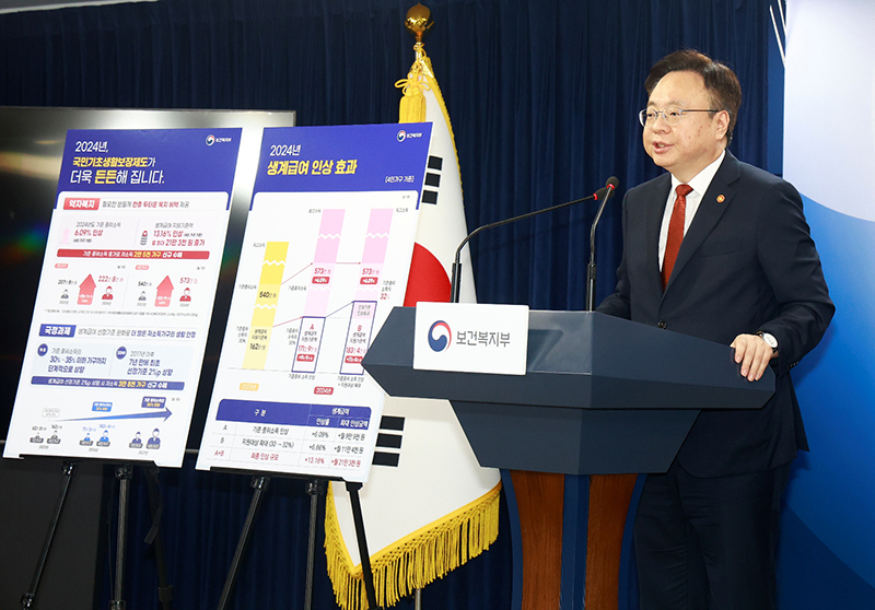 정부가 2024년도 4인 가구 기준 생계급여 지원기준을 역대 최대 수준인 13.16% 인상한다.