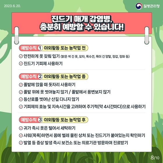 진드기 매개 감염병에 대해 자세히 알아보고, 야외활동 시 진드기에 물리지 않도록 예방수칙을 꼭 지켜주세요!