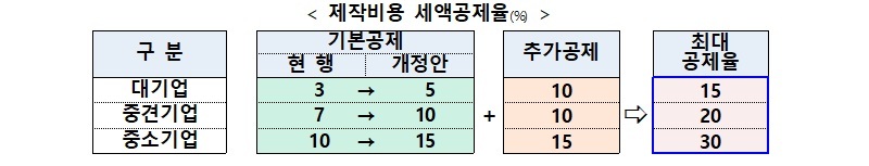이에 따라 최대 공제율이 중소기업 30%, 중견기업 20%, 대기업 15%로 획기적으로 높아진다.