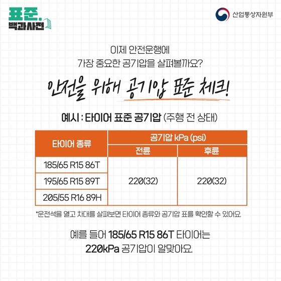 예를 들어 185/65R15 86T 타이어는 220kPa 공기압이 알맞아요.