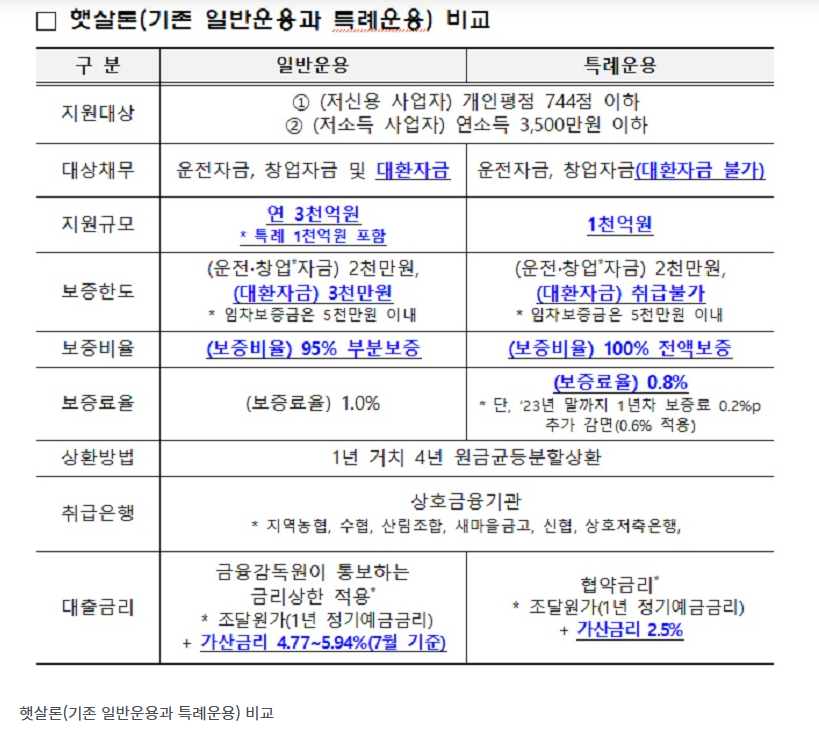 현행 사업자를 대상으로 하는 햇살론은 지역신용보증재단이 보증비율 95%, 보증료율 1% 조건으로 보증서를 발급하면, 저축은행 등 서민금융회사가 9% 내외의 금리로 대출을 시행해 왔다.