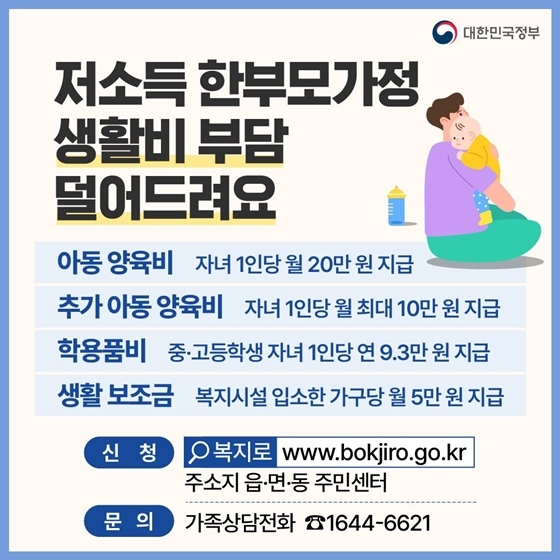 7. 저소득 한부모가정 생활비 부담 덜어드려요.